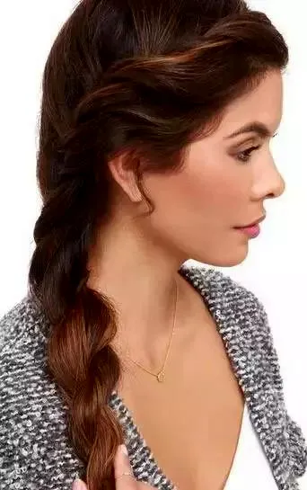 step2:不断并入后方的头发编成辫子,一直编织到发尾处。