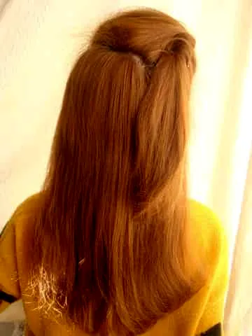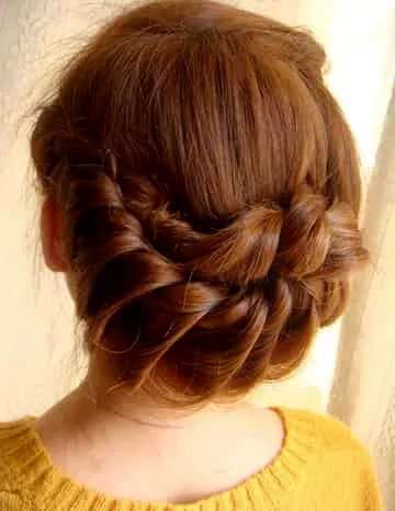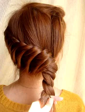 第三步:一直扭到头顶处垂下的发尾,也将其加进去,接着剩下的头发继续扭,此时发股会越来越大,一直编至发尾处。