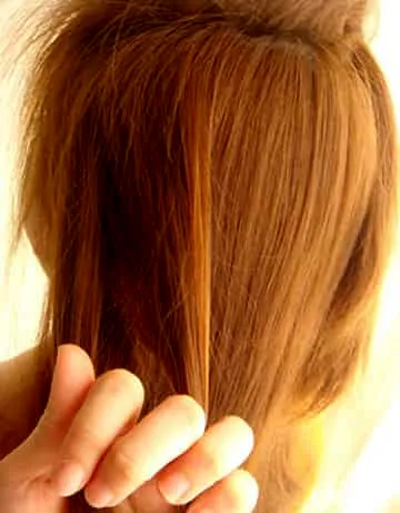 第四步:接着将发尾由下至上翻转上去,用黑夹子固定好发尾处。