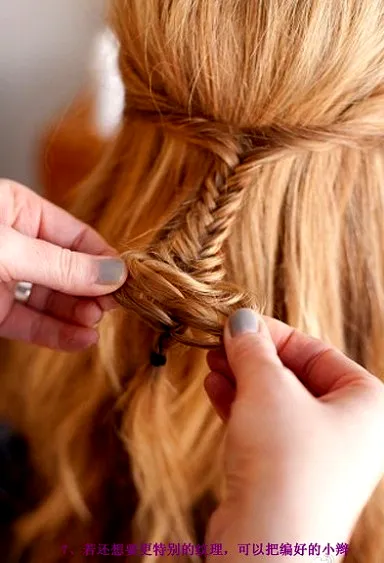 步骤七:编好之后,用小皮筋扎好,然后用手轻轻把辫子扯松,这样这款唯美浪漫的鱼骨辫公主头约会发型就完成啦!