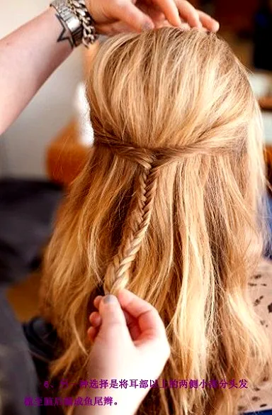 步骤六:将这两撮头发合在一起开始编鱼骨辫,鱼骨辫教程本站很多哦!不会的MM可以找来学学,很简单的哦!