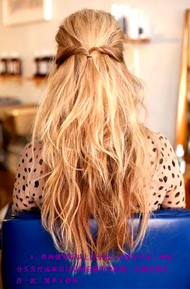 步骤五:将两侧齐耳以上的头发各取一撮,然后把它们拧成麻花以后在后脑**交汇,用橡皮筋扎起来,现在算是简单又俏皮的公主头哦!