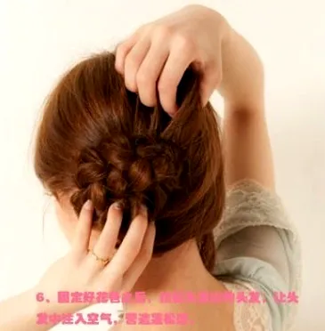 步骤六:盘好之后用小夹子固定发尾,用手抓松头发,让头发注入空气,营造蓬松感。
