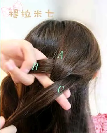 步骤二:继续取一束头发标记为C,从头发的一侧开始编,按自己的喜好选择位置哦!