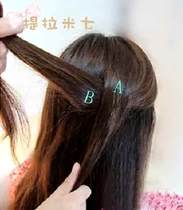 步骤一:将头发分成上下两部分,从头上一侧取两束头发,标记为A和B,按三股辫的方式开始编。