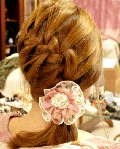 步骤六:根据自己的喜好系上一朵甜美的花朵发饰,这样一款浪漫的韩式编发发型就完成啦!