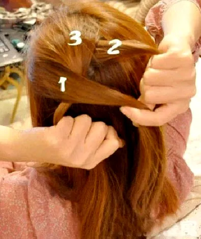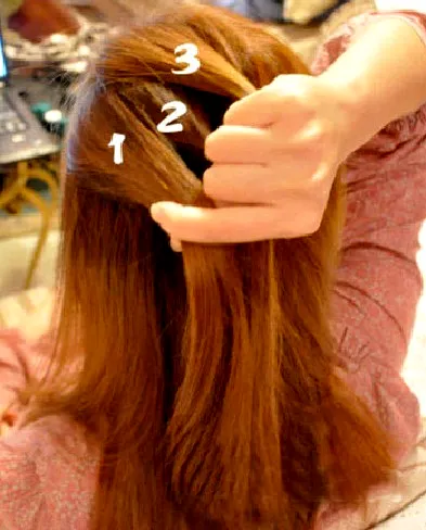 步骤二:从左边头顶取一束头发如图分成三份,分别标记为1、2、3。