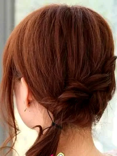 步骤四:将辫子编至脖子处即可,再用皮筋固定好。