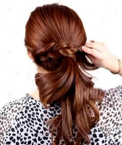 步骤五:把编好的麻花辫拿起绕着马尾一圈,一定要把皮筋给遮盖好。