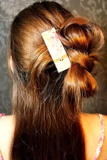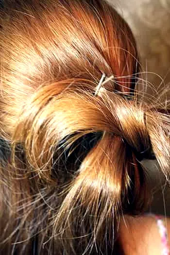 步骤五:把穿过来的头发发尾处用小发卡如图所示固定好。