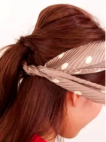 步骤七:这时候将发带绕过皮筋扎起的后部,把前面预留的两侧头发也利用发带扎上去。