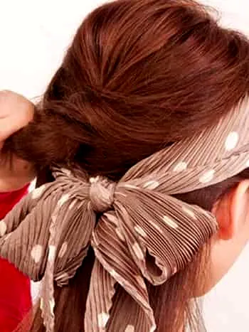 步骤八:在皮筋下方把发带扎成一个蝴蝶结,并再将扭转的发尾处弄的松散一点。