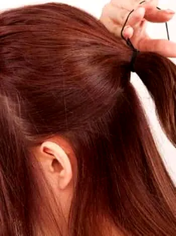 步骤三:从两侧耳朵上方向中间挑取一束头发,将这束头发在脑后扎成一个马尾。