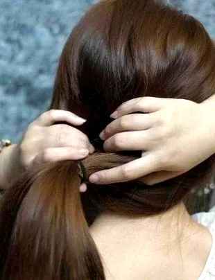 步骤八:开始塞马尾,把马尾全都塞进洞里面,要往右边塞多点,因为那里的空间比较大。