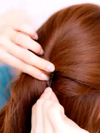 步骤三:再使用一个小发卡把头发向上推动固定住,让上部分头发可以拱起来。