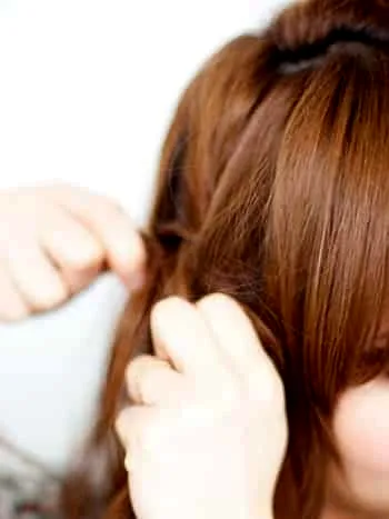 步骤一:先将头发披散下来,从耳朵处分成上下两个部分,并把上面那部分头发挑出来向同一个方向进行扭转。
