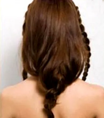 步骤三:把三个小麻花辫拉到耳朵后面,与下面没有编的头发合成三股,继续编个大的麻花辫。