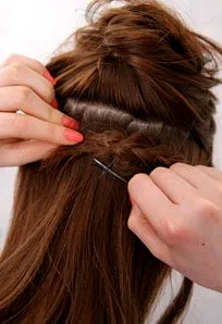 步骤三:左边也一样的方法编成三股辫,把右边的辫子提上来,往左边方向放在头顶上,用夹子夹住,左边放右边固定。