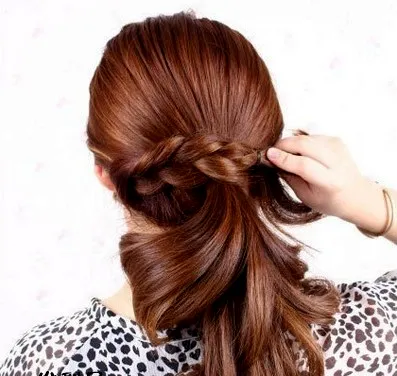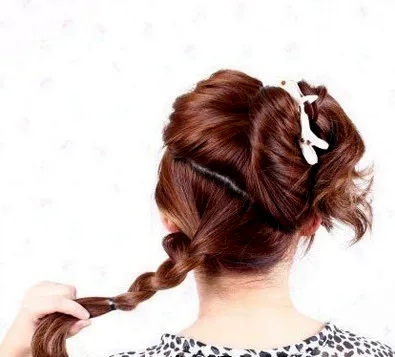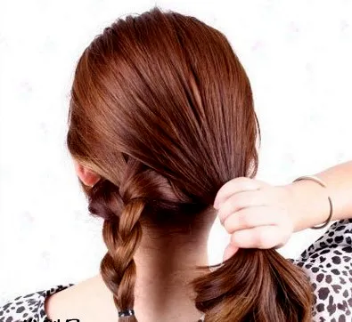 步骤五:把左边的辫子,围着马尾绕一圈,要把皮筋遮盖住。