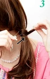 步骤二:图一,用黑色的橡皮筋扎一个低低的马尾。