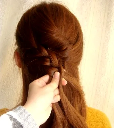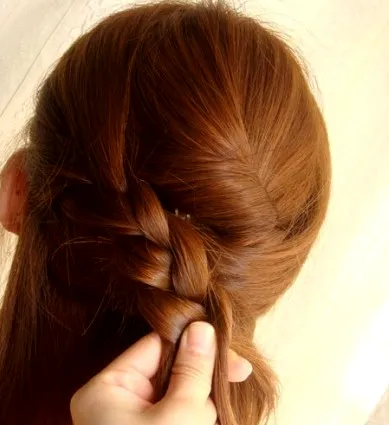 步骤九:编到中间的位置时,从右边取一股头发叠加进去,继续编。