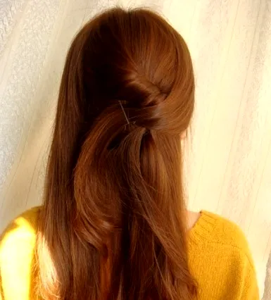 步骤六:把开始分好的右侧头发,抓到左边来,在扭转的发束处,遮住刚刚固定的夹子。
