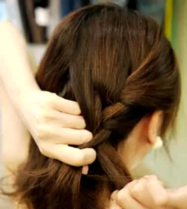 步骤三:将编发每编两节就从下方加入一束头发,类似于蜈蚣辫的编法哦。