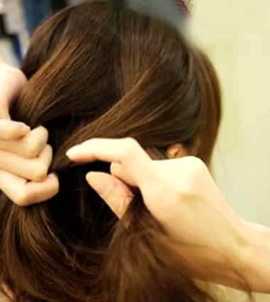 步骤七:将编好的1号发辫发尾处向2号发辫内收,并用小发卡固定好。