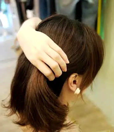 步骤一:先将披肩短发披散下来,再从中间将头发分成左右两个部分,将右侧的头发拢至耳朵后面。