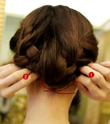步骤八:把2号发辫向1号发辫内收,两个发辫刚好形成交叉状,用小发卡固定。