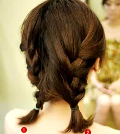 步骤六:编至发尾处,用皮筋固定好,并如图所示将两个发辫标上1和2。