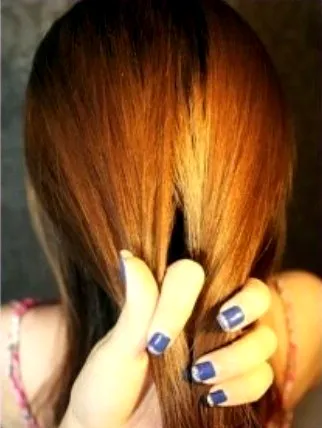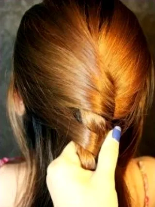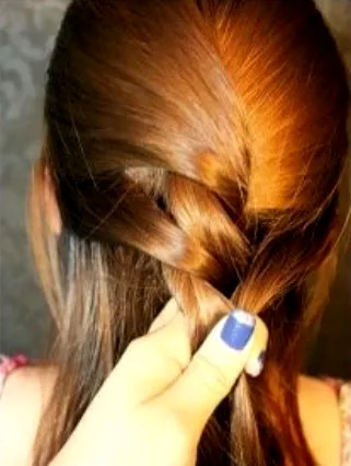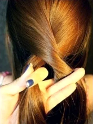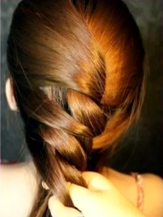 步骤五:在相互重叠两次后,从左手取出一股头发与其中一股头发合并在一起。