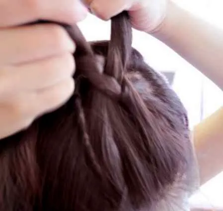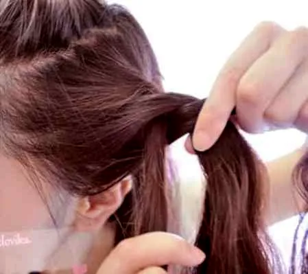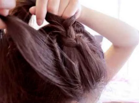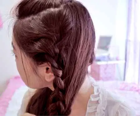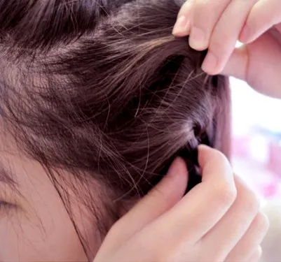 步骤五:辫子的方向开始往侧面,取侧面的头发往辫子里面加,就是从辫子底下挑一缕头发加入三股辫中最顺手的那股里面。