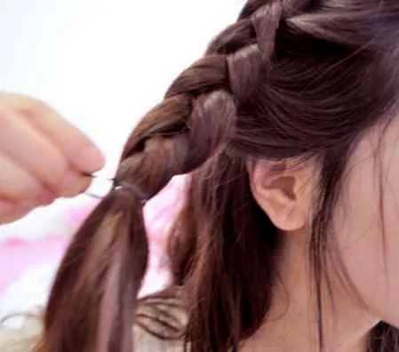 步骤六:按这种方法顺着侧面一直编下来,编到耳朵下面的位置用橡皮筋把发尾扎起来。