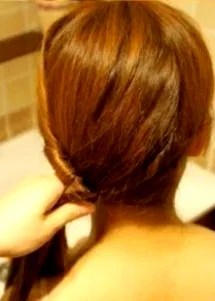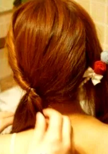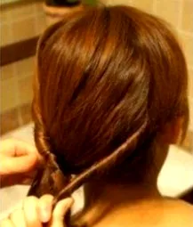 步骤二:马尾绑好后,就把左边固定的发束散下来,向内方向扭转起来。