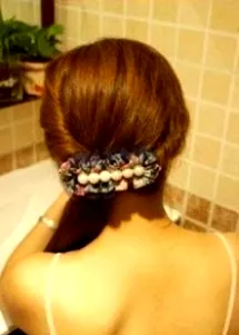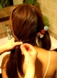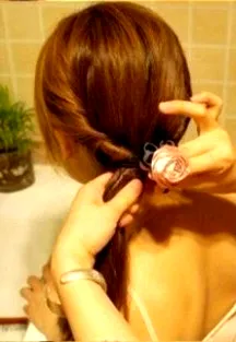 步骤五:扭转好后,把发束放在马尾的下方,用黑色的一字夹固定住。