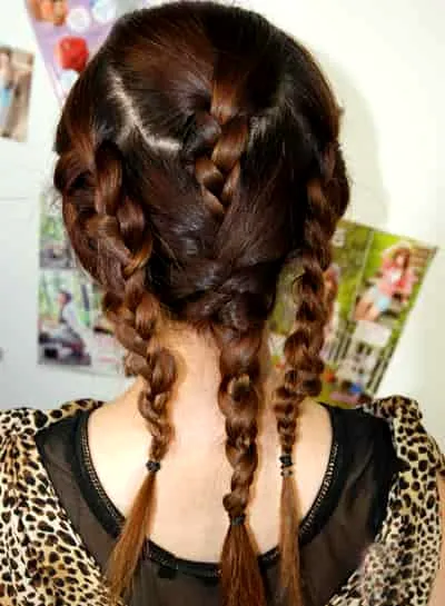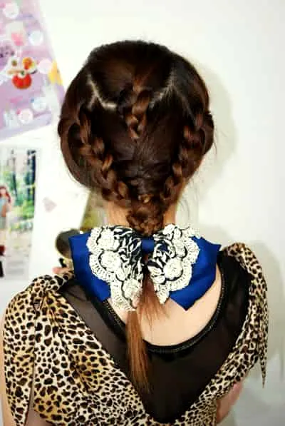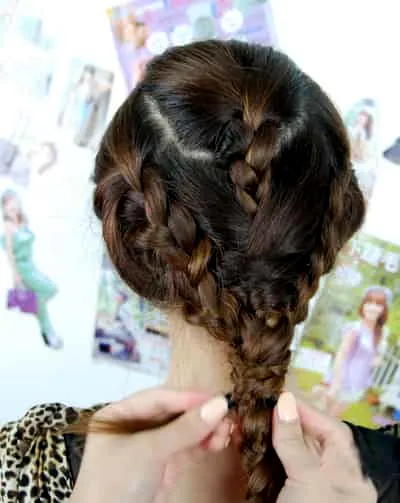 步骤九:最后把用两侧的发辫缠绕在中间的辫子上,用皮筋固定。