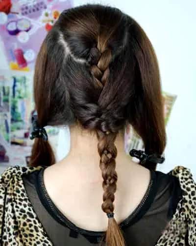 步骤三:将头发分成三份,中间的那份头发再分成上下2份,辫子编好后,就用小皮筋固定住。