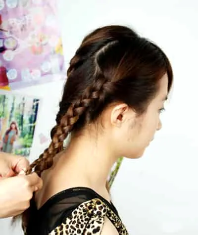 步骤八:左边也以同样的方式,编成普通的麻花辫。