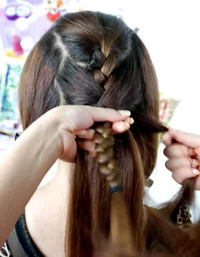 步骤二:先在刘海后方的头顶处取一束头发,编成普通的麻花辫。