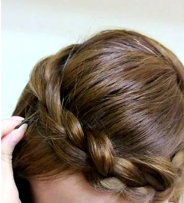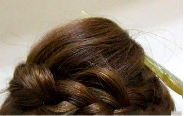 步骤三:辫子编好后,用皮筋固定好,然后再将辫子往前额的方向绕一圈,中间的头发会微微凸起,绕的位置可以顺着分线绕,将分线盖住比较美观。