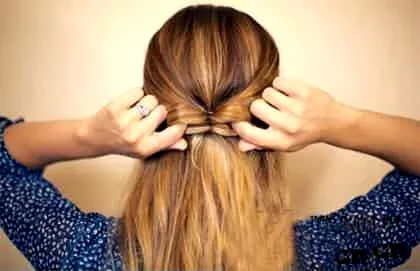 蝴蝶结发型一步骤三:扎好后,用手将突出的头发,从中间处分出两部分,然后向左右拉开,抓出有洞的样子。