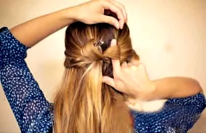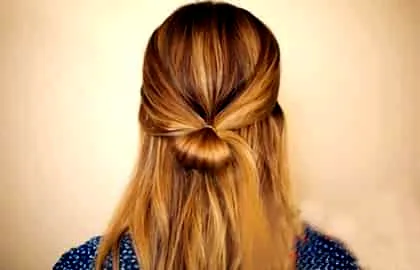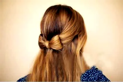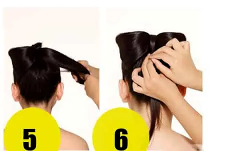 蝴蝶结发型一步骤五:抓出留下的发束,绕着蝴蝶结左右的中界转圈,看上去就像是用头发捆住的一样。
