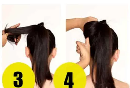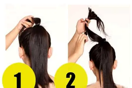 蝴蝶结发型二步骤四:将头发一直卷,卷到马尾根部,做成蝴蝶结的形状,用小黑夹子固定住。