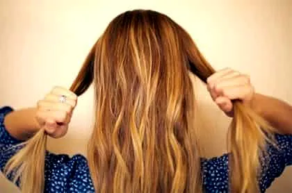 蝴蝶结发型一步骤一:将头发梳柔顺了,散在肩后,然后从头发两边各取出一股头发,发量适中,但两边的发量要差不多,抓在手上。