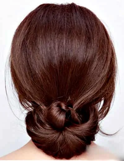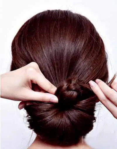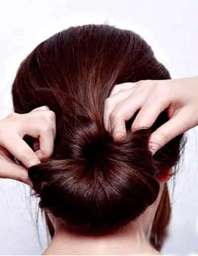 扇形低发髻步骤三:将其余马尾头发缠绕在一只手上,向上卷至马尾根部,并用黑色的发卡固定,然后用双手向上微微提拉发圈的两侧,形成一个半环形的发髻,用发卡固定造型。