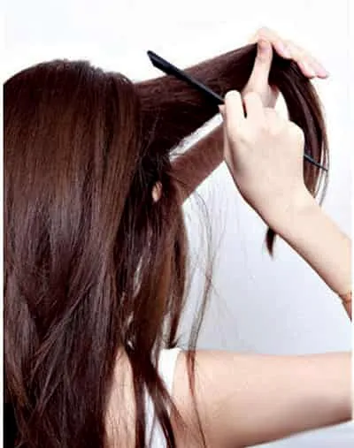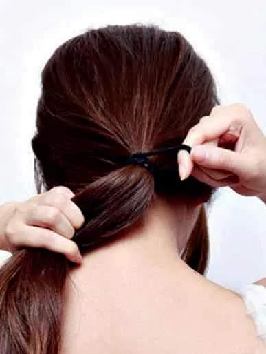 扇形低发髻步骤二:用橡皮筋束一个低低的马尾辫,并从马尾上部取出一束头发待会儿备用。