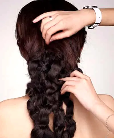 两边都编织好了以后,就可以将中区后面的头发打毛里层,使头发变得非常蓬松,然后梳滑表层,这样就看起来非常饱满,起到了垫高的作用。