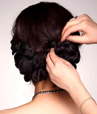 接下来就是将假发与真发相结合,将假发扭曲式摆放有序的放在真发两侧做衔接,使得整个造型看起来非常饱满自然。