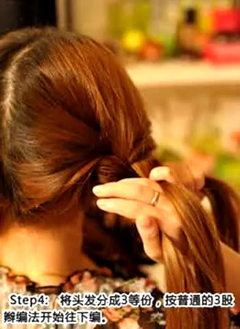 步骤四:然后将头发分成三份,开始编织三股辫。